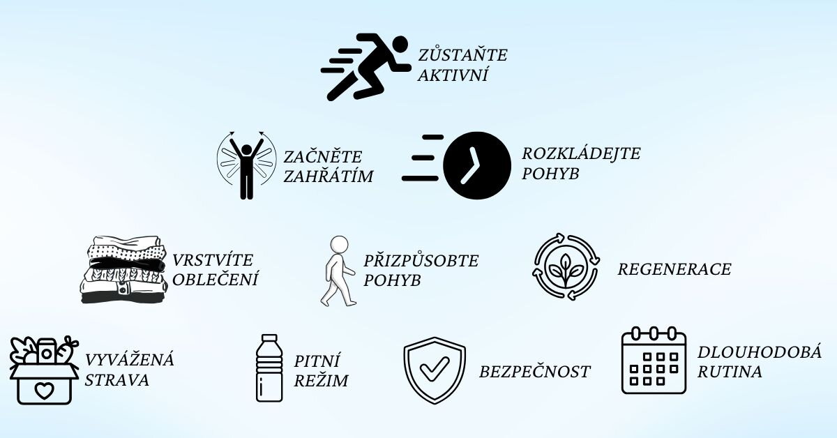 - Dbejte na regeneraci a odpočinek. Regenerace je nedílnou součástí péče o pohybový aparát. V zimě, kdy je organismus vystaven chladnému prostředí a kratším dnům, má odpočinek stejnou váhu jako samotný pohyb.